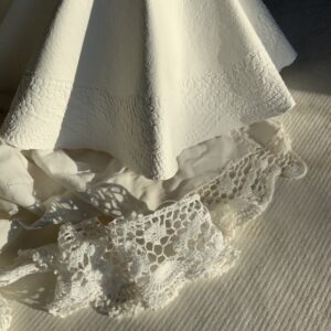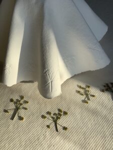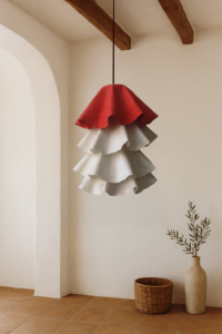 Esa esencia de volumen y expansión es la que inspira esta lámpara, que convierte la forma textil en luz. El papel con el que se construyó fue elaborado artesanalmente a partir de fibras vegetales recolectadas en el campo de Sevilla y de telas reutilizadas de antiguas sábanas. Gracias a esta mezcla, el material adquiere cualidades cercanas a un textil y conecta directamente con la inspiración de la falda. Los gofrados incorporan tanto elementos botánicos como encajes recuperados de las sábanas, sumando capas de memoria y ornamento al objeto.